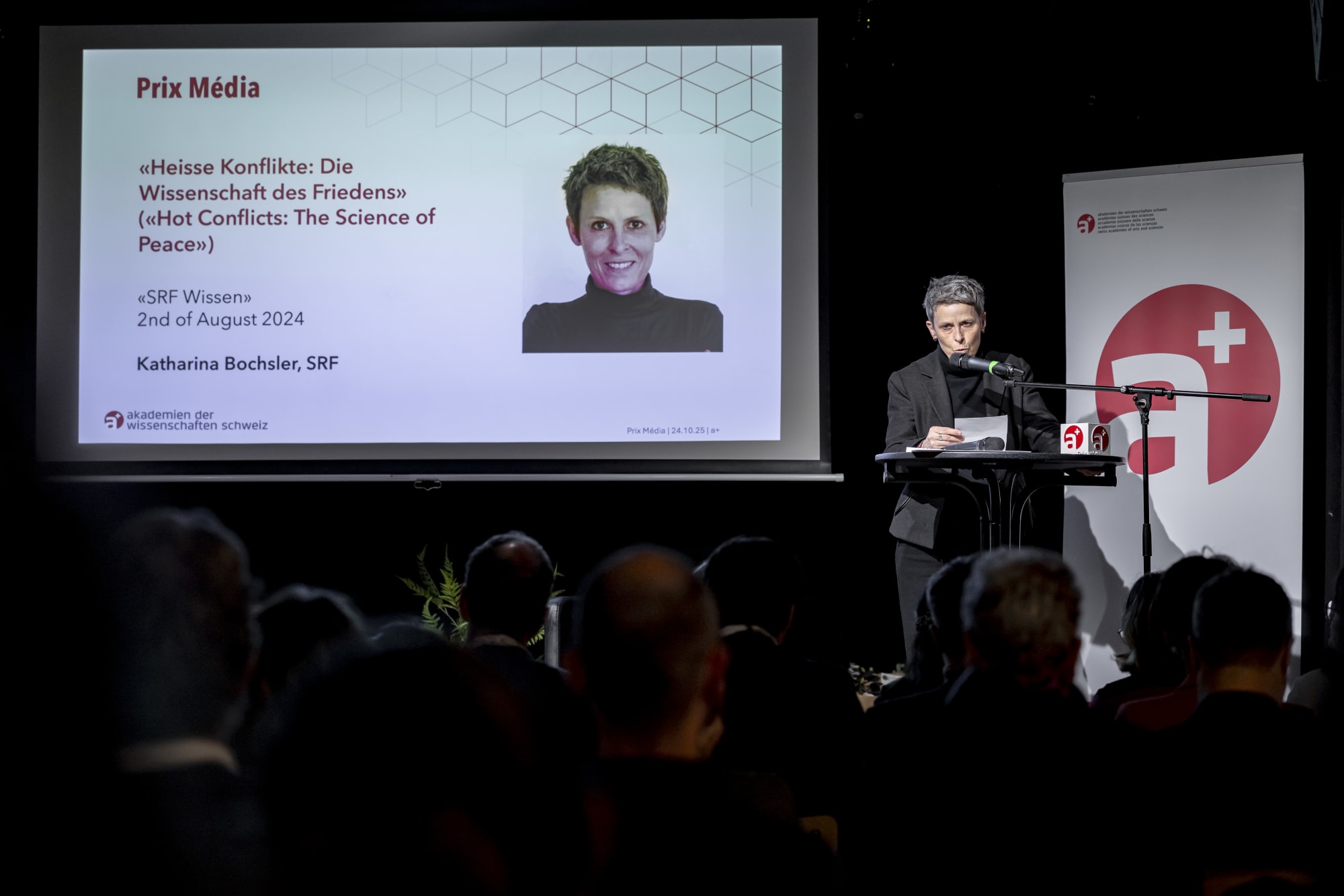 Der Prix Média 2025 geht an Katharina Bochsler, Wissenschaftsredakteurin bei Radio SRF, für ihren Beitrag «Heisse Konflikte: Die Wissenschaft des Friedens». Obwohl gesellschaftlich hoch relevant, ist die Friedensforschung nur selten Gegenstand medialer Berichterstattung. Katharina Bochsler gelingt mit ihrem Radiofeature ein meisterhafter Brückenschlag zwischen dem komplexen akademischen Diskurs und einer greifbaren und verständlichen Erzählung. Die Jury hob besonders die reflektierte Herangehensweise der Autorin hervor: Katharina Bochsler richtet den Blick ausdrücklich auf die Wissenschaft und bezieht dabei unterschiedliche sozialwissenschaftliche Perspektiven ein. «Heisse Konflikte» zeigt eindrucksvoll, wie kraftvoll und relevant Wissenschaftsjournalismus sein kann. Der Prix Média ist mit 10'000 Franken dotiert.